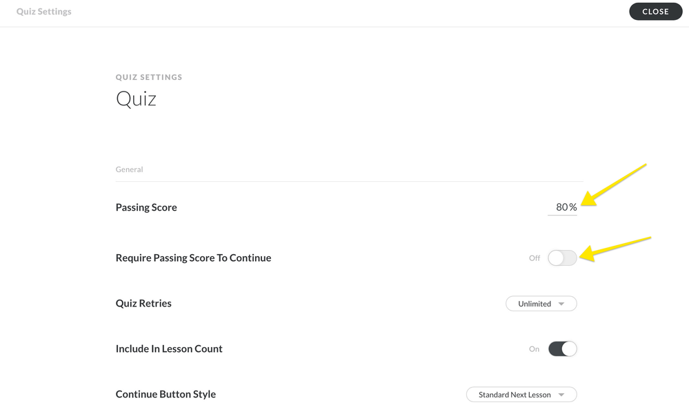 Thanks, Tom. Since you selected "Track using quiz result" on the export page, learners won't be marked "complete" until they reach the passing score set on the course settings page. They will still need to reach this score even if "require passing score to continue" is turned off.