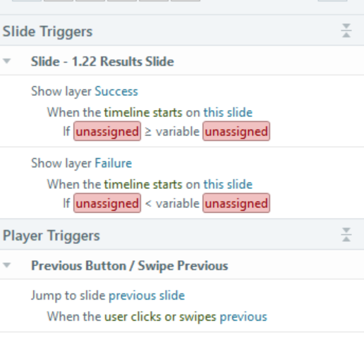 The "unassigned" values are trying to look at some scores. If you select the "unassigned" values, a dropdown box will be available. In a nutshell, it's trying to check the users score against a Passing Score (in your case 100%). I can't remember the exact name of the variables off the top of my head, but they are quite intuitive and you should be able to figure out which variables to select.