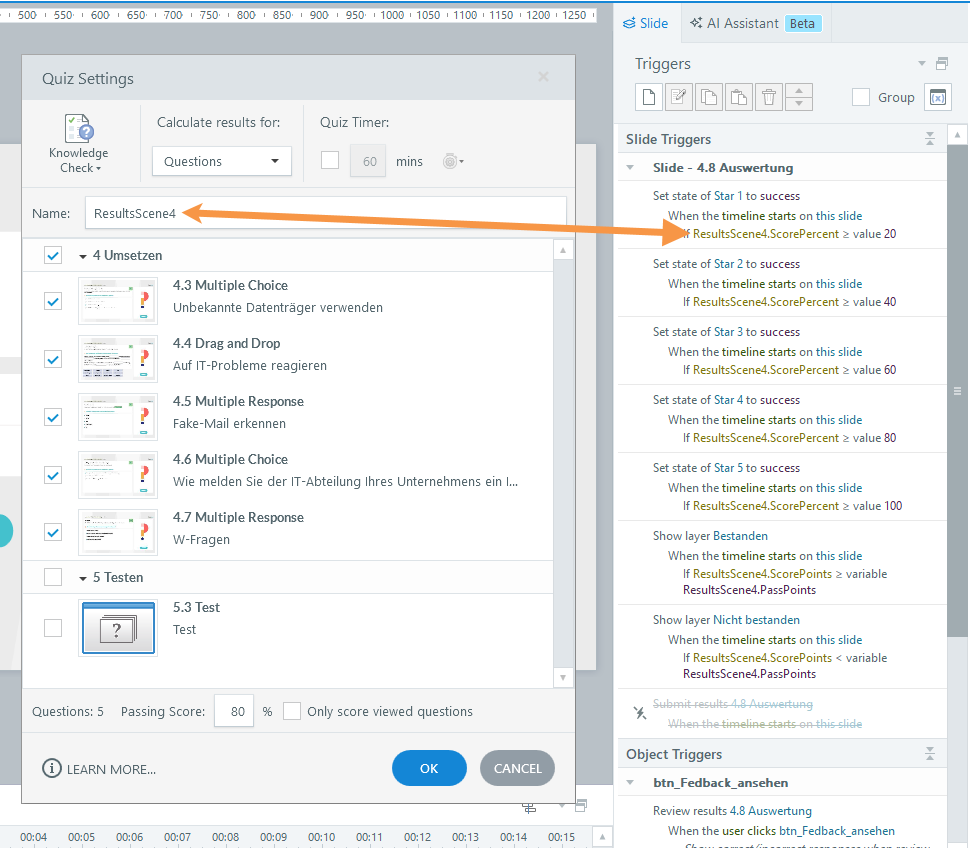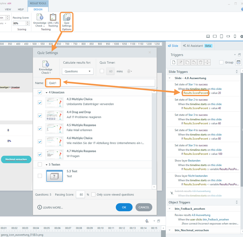 I’ve checked the variables in the triggers, but everything looks exactly the same as usual. The only thing I noticed is several built-in variables like “Quiz1.PassPercent”, “Quiz1.PassPoints”, and so on, which are not normally included. However, they aren’t used anywhere, so that shouldn’t matter, right? I also tried to delete the results page and copy it from our templates again, but that only led to variables with identical names.