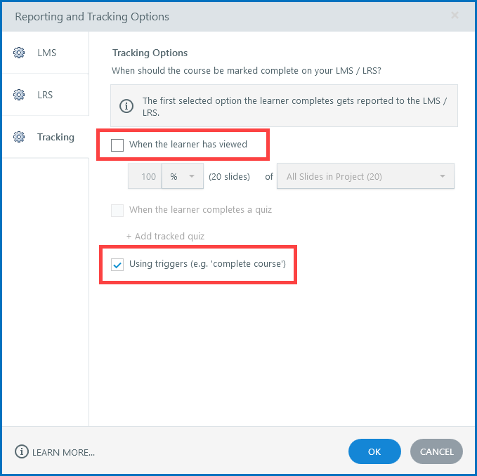- When the learner has viewed a designated percentage of the course