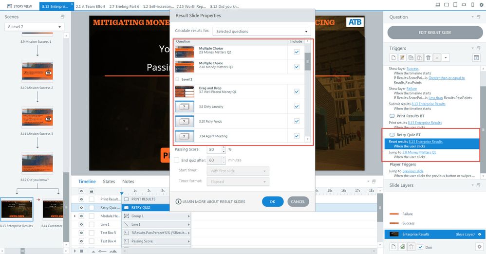 On both Results slides, I've added a Retry Quiz button with a Reset results trigger and a Jump to Question (first question) trigger in that order. The problem is when clicking Retry Quiz, it doesn't show all the quiz questions and pulls up other non quiz slides.