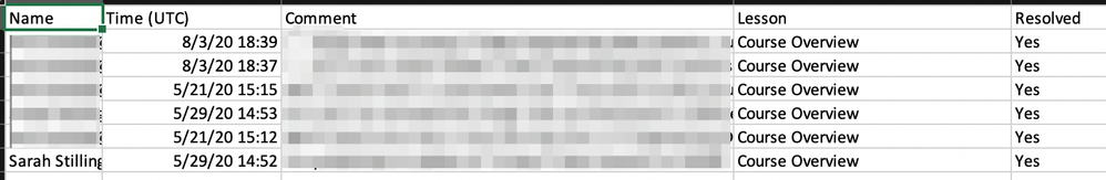 Hello, I'm trying to export comments for a course in Review 360 however only comments from the first lesson are exporting. I've attached screenshots of the Feedback tab (partial) and the resulting csv export (full) to show the discrepancy.