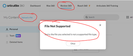 I tried following the link at https://articulate.com/support/article/Review-360-Manually-Upload-Storyline-360-Courses to upload a zipped SCORM Package to Review 360, but I received an error message ...