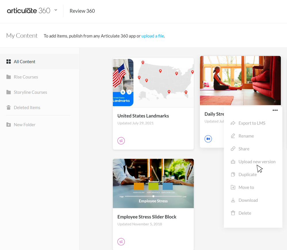 You can even upload new versions of an existing video or Storyline 360 course. Simply click the three dots on the right of your course’s cover screen and select Upload New Version. So easy!