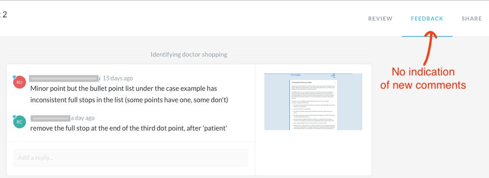 Not sure if you will see it not working, I am just starting to work on the feedback comment/edits now, so they will gradually disappear but if you look soon you will see hopefully what I see. Unread comments but no feedback number.