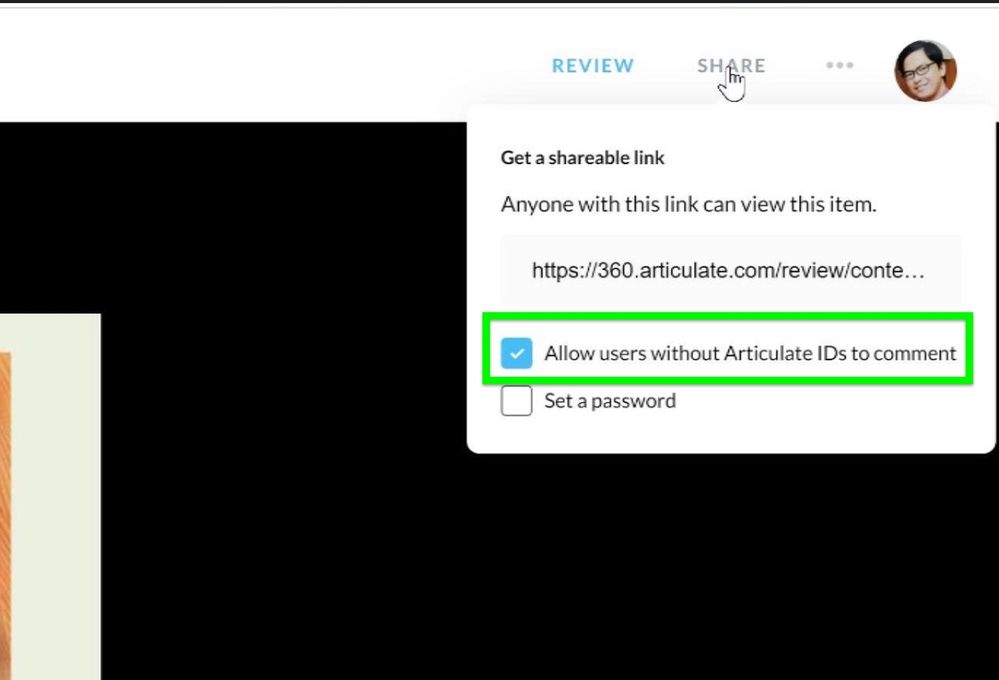 Thanks for sharing the details, and I'm sorry for the trouble! Kindly check whether the "Allow users without Articulate IDs to comment" option is ticked. If this box is unticked, reviewers without an Articulate ID will be prompted to create one.