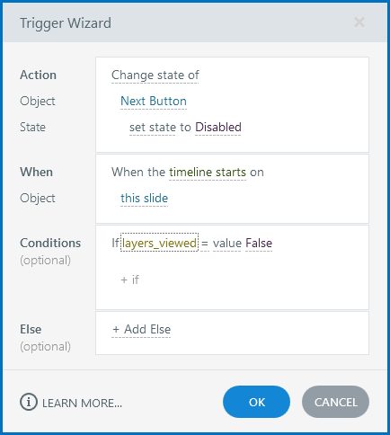 - to do this, I removed the no next (verbiage) layer then added an object trigger to set the state of Next Button to Normal when the state of all of the ovals is Visited. The result is the next button is greyed out until the learner clicks each button. So that works as desired.