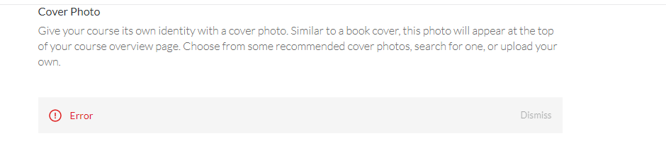 Hi Sabina, so sorry to hear you're having trouble uploading your cover photo. If you still need help with this, can you try making sure that you're using a supported browser for authoring in Rise. You can also try using incognito or private browsing mode when you access Rise. Let me know if that helps!