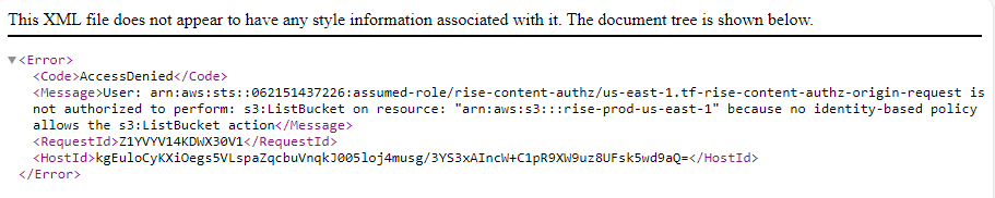 The error message typically means that the contents inside the folder where your PDF is stored are not publicly accessible. You might be signed in to certain accounts allowing you to access the folders when tested directly on your computer, but this access level changes when the course is uploaded to an LMS. Please ensure you have your Amazon S3 bucket permissions set to the level that allows public access.- MMc-HSECommunity Member