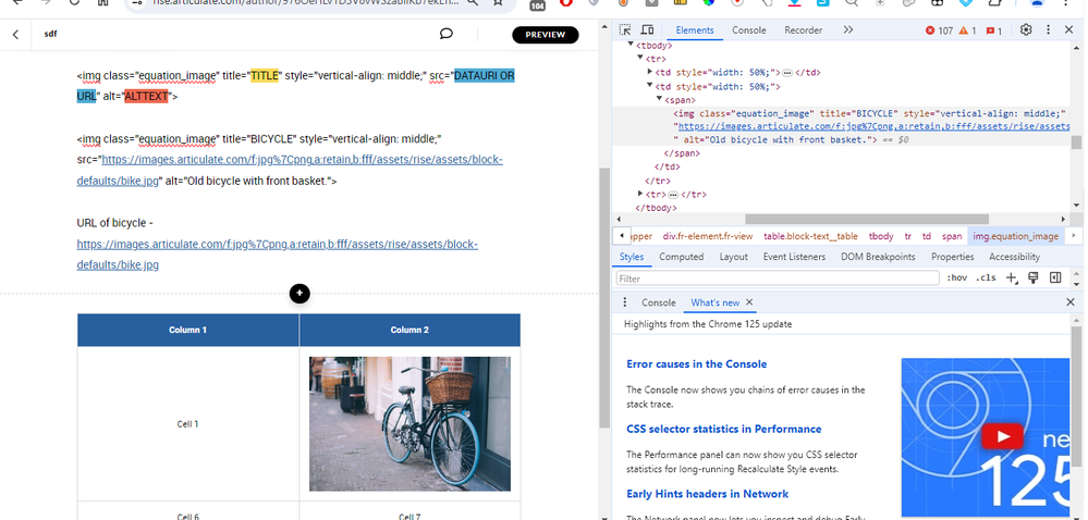 Does anybody have a trick how to use images in tables in Rise360? AFAIK, it is not possible out-of-the-box, it may be possible in debugging mode with a lot of hand-editing HTML code, but has anybody found an easier cheat for this?