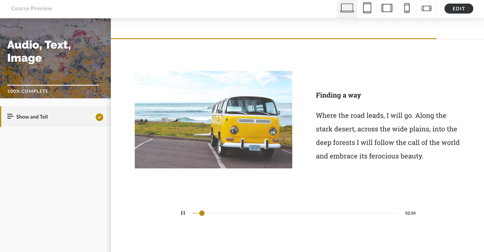 But Crystal...the learner has to manually click on the audio block, correct? Or is there a way for the audio to automatically run within the block or on the page without the manual click. That's what I really need for a project I'm working on. My audio doesn't need to be placed in a specific spot on a timeline, as in Articulate 360...but it does need to just play from the beginning of the block/page. Is that at all possible?