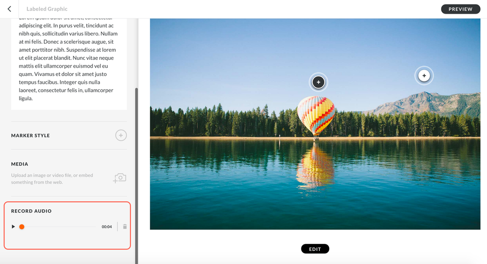 You can record a voiceover in a labeled graphic interaction. Simply click on the plus icon to edit the label, then click Record Audio at the bottom of the edit panel.