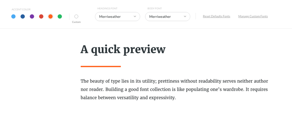In this button block, the heading and body text are both Merriweather. The font in the body is a thinner version of Merriweather, but you can set it to bold, if you like.