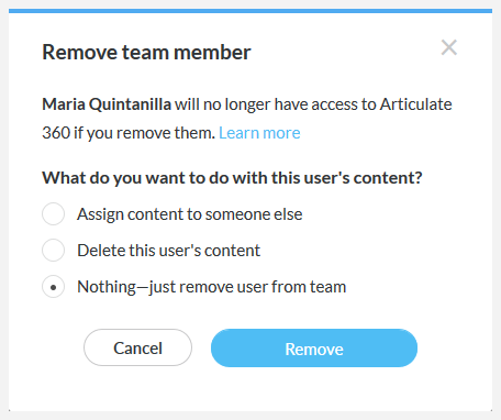 3. The user’s Rise 360 courses and Review 360 projects remain on our servers for at least six months. During that time, shareable links for the projects continue to work, so your team can still view them.