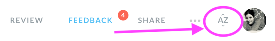 When you are in Feedback view in Articulate Review, you can choose to sort your comments "by recent" (indicated by a clock icon) or "by lesson" (indicated by AZ).