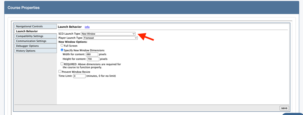 You can try playing around with the Course Properties section of your LMS to see if you can find there the option to control how your course is launched similar to what's shown here: