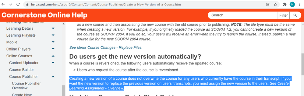 Hi Alyssa - I'm at the junction of deciding whether to create a series of courses in Rise or Storyline. They will need to be housed in/launched from Cornerstone. In reading this thread about versioning Rise courses in Cornerstone, I'm wondering if this will be an issue. The courses will be updated from time to time. Sometimes we will require the learners to retake the course - other times the previous version will count as an equivalent. Do you know if Rise courses still need to be deleted and loaded as a new course when they are versioned in Cornerstone? And if so, I'm wondering if that loses the link between the two versions and learners who previously completed the course would now show up as not having completed it. ??