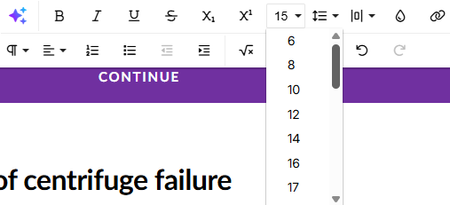 Great call reaching out about this. Although the font-size dropdown doesn't list 15 as an option, please try highlighting the current font size, type in 15, and select Enter. Here's a quick demo showing you how it worked for me. If the text size doesn't change or you have additional questions, please let me know!