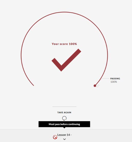 Hey there! I have set up a course that has two languages in it. I have to put everything together b/c the branching won't recognize in our LMS. I have a quiz they are required to achieve 100% and move forward for each language within the course. I have it set up where both languages are included but navigate them for their own language and then come back in the end. My issue is the one quiz will not allow me to continue even though I pass 100% I've included a picture for you to see I'm not crazy. How can I get this to continue after they pass the quiz. Is there any reason it wouldn't continue?
