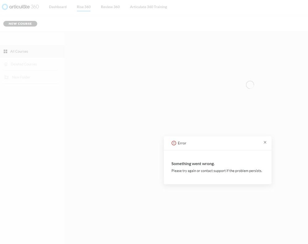 I'm also having the same issue. I was editing my course, then got the error message now none of my Rise courses will load, just the spinning wheel.
