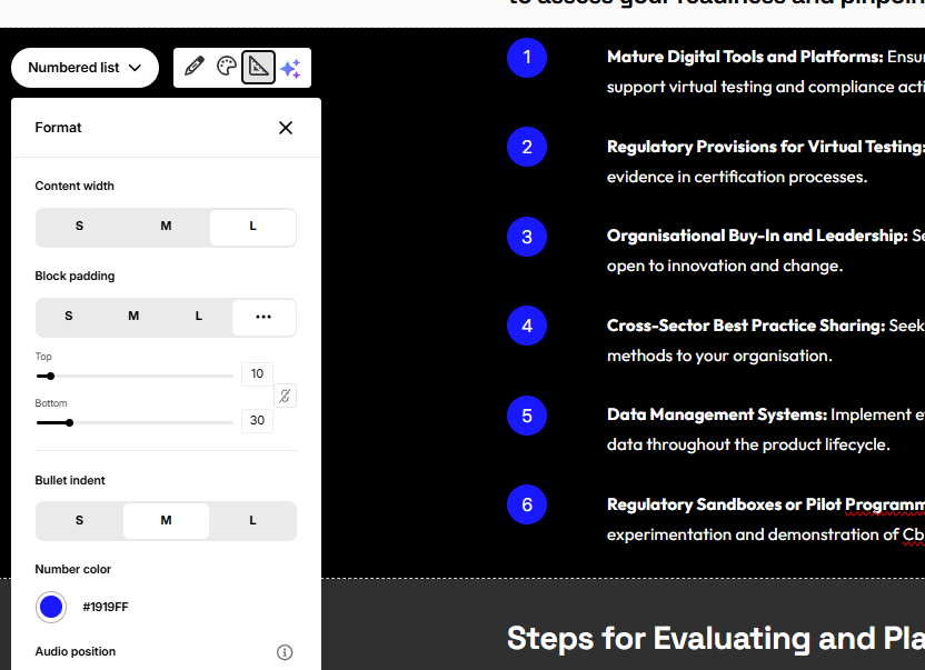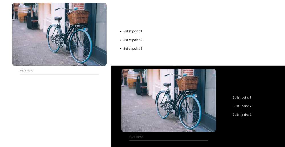 I've been having an issue with the Rise text and image block when I want to use a black or dark background color; the text doesn't change to white. It's mostly an issue with bullet points: even if you change the text color manually, the bullets stay black, so you can't see them.