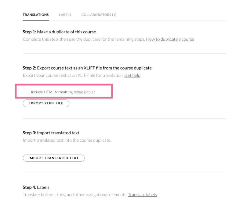When this option is selected, you'll see additional HTML tags and extra spaces in your XLIFF file. There are used to preserve formatting when you import your translated file, but sometimes the tags don't work with some translation software. Removing this option exports your content in easy-to-translate blocks of text. However, it doesn’t contain the coding necessary to maintain any formatting you’ve applied to that content.