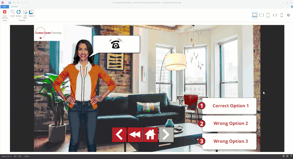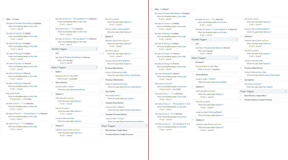 - If you have triggers that run "when [variable] changes," be sure you only use such triggers on the same slide that the variable changes. (The program doesn't "see" a variable change that happens on another slide.)