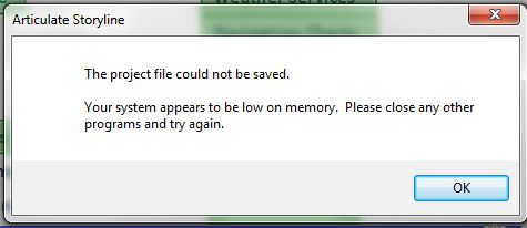 Hi I am not able to save my storyline file after 20 minutes. Message showing "project can't be save not enough memory". But computer have 16 GB memory and 1 TB hard disk with window 11 updated version. This problem was coming in window 10 also. Is someone can help me out.