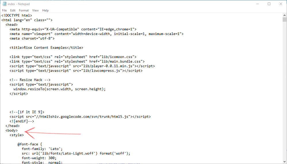 So you've got your completed block of code. Now what? Well, you need to paste it in your course's 'index.html' file. Simply open it up using a text editor, like Notepad, and paste in your code after the <body> tag: