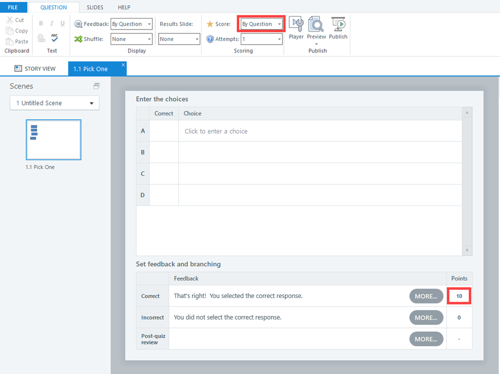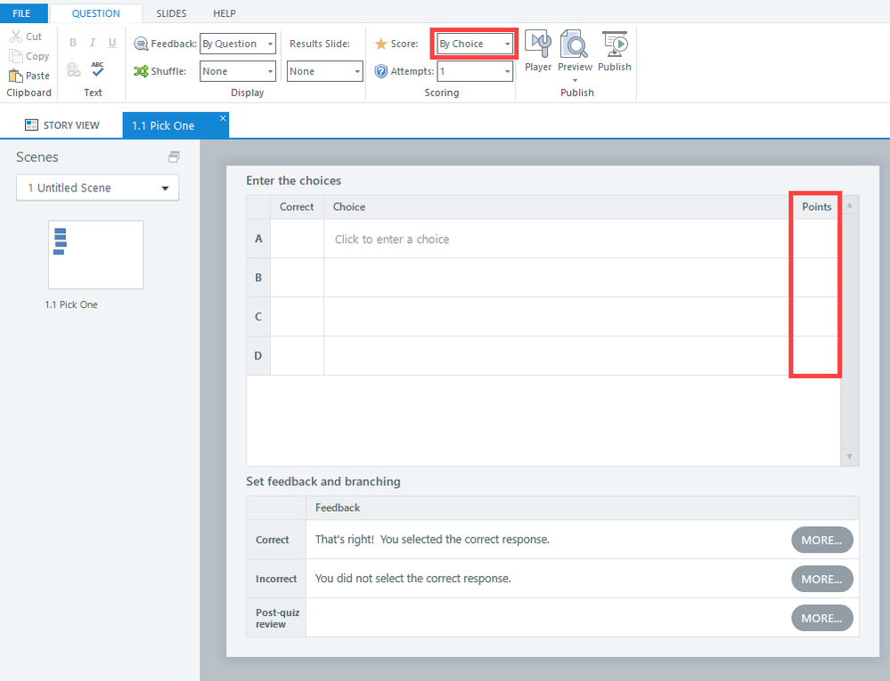 For "pick one" types of questions, the "score by choice" option lets you assign different point values to each response.