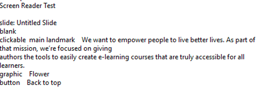 A paragraph, in articulate 360, using Arial or similar font isn't read by the screen reader.  Buttons, etc. are read.  Am I missing something?  Do I need alt text tag or?