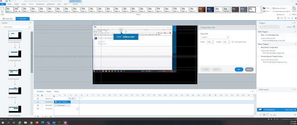 My story size is 1366x768 in Articulate. When I record the steps, I change my monitor resolution to match and record it full-screen. However, in my output, there's a lot of black to the right and bottom.