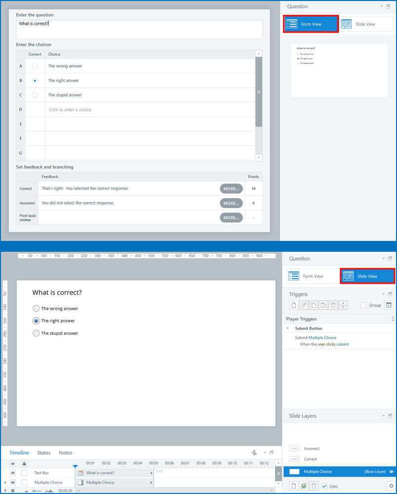 Also, be sure that you've indicated the correct answer for each question. In Slide View, that shows as the button looking selected when you're editing. In Form View, the correct item should be selected in the Correct column.