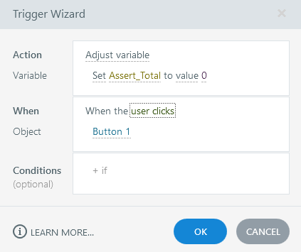 - FYI: In the Trigger Wizard window, a dashed underline indicates that the item is editable. That's how you can select Set vs. math operations and how you can set a specific number vs. using another variable's value.