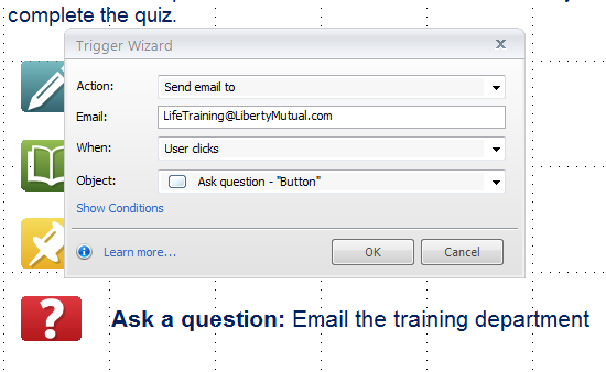 When adding an email trigger to your Storyline course, be aware that there are certain requirements that must be met by each user’s computer for the trigger to function properly: