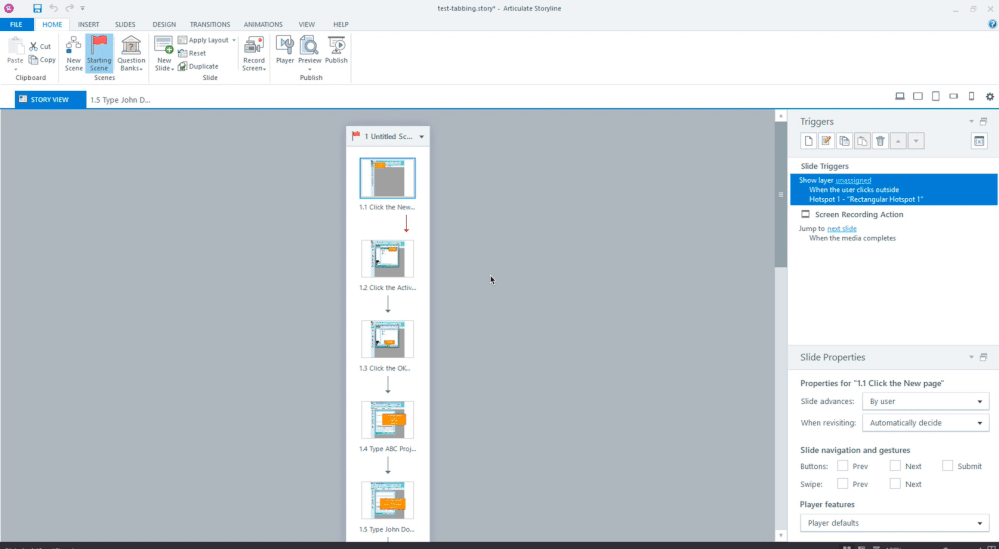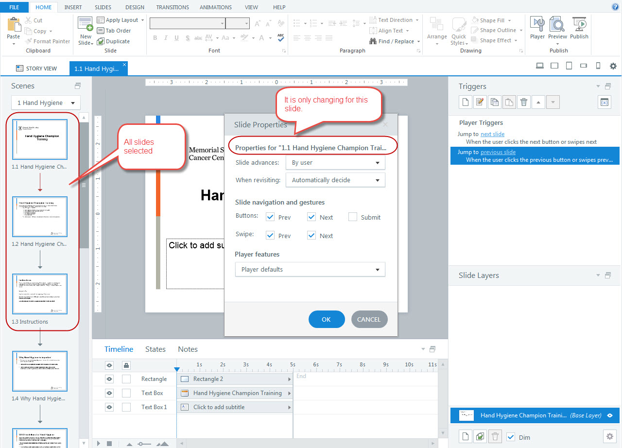 I am having same issue as Erica. Whenever I import from PPT the default is Slide Advances Automatically but I cannot change all slides at once to Slide Advances By user. I have tried manually clicking on each slide to select them all and I also used Ctrl-A to select the entire scene but when I get into the menu it lists only the first slide (even though all slides are selected). The properties are changing only for that slide. This happens on every project. Screen capture below.