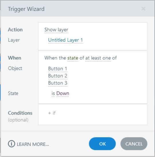 Although one trigger only have one "when", you can utilize state to trigger one thing by "when any/all objects are in different states" if all your conditions are clicking on objects. Below is an example to trigger a layer when user click any of the BTNs.