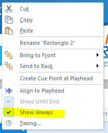 I am trying to figure out what happens when I select "Show Always" in the right click menu for an object in the timeline. When I right click an object, such as a shape or button, check "Show Always...