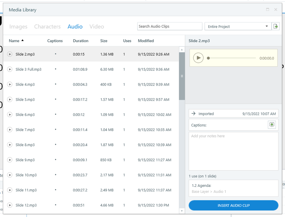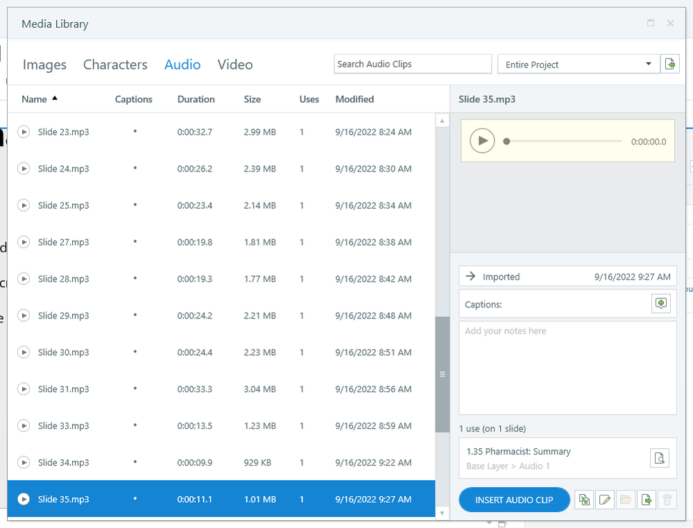 In Storyline 360, we just introduced a media library where you can batch upload and export audio. That's not available in Storyline 3.
