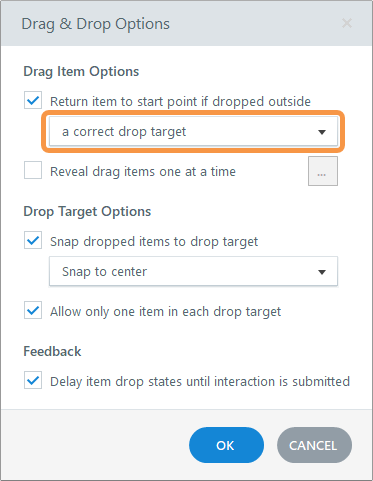 I also suggest that you adjust the Drag & Drop Options so an item will be returned if dropped outside "a correct drop target." This prevents the user from dragging an item to the wrong target. (That may not be likely, but it is possible when the options are set to return if dropped outside any target.)