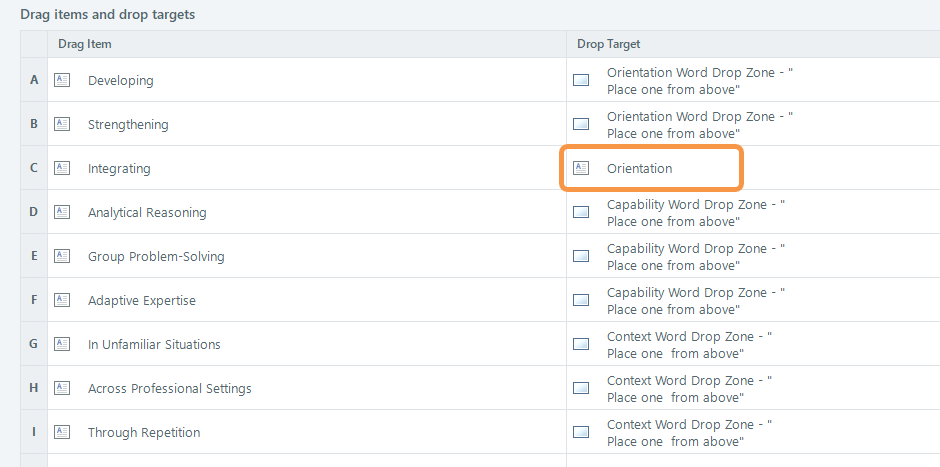 The main problem is in Form View." Integrating" is assigned to be dropped on the "Orientation" label. That means it'll never be "correct" when dropped on the desired drop target.