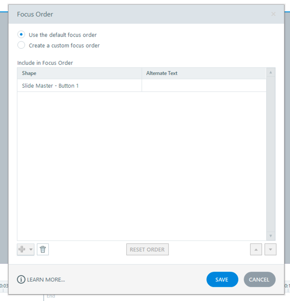Thank you for your response, Luciana. I understand that the focus order can only be changed on the slide. However, I need to make that "Rectangle" object on the master slide inaccessible but I cannot see the "rectangle" on the slide master to make it inaccessible. That is the problem. It doesn't show up on any timeline, so I cannot right-click it to change it to "inaccessible" in the size and position option as direct.