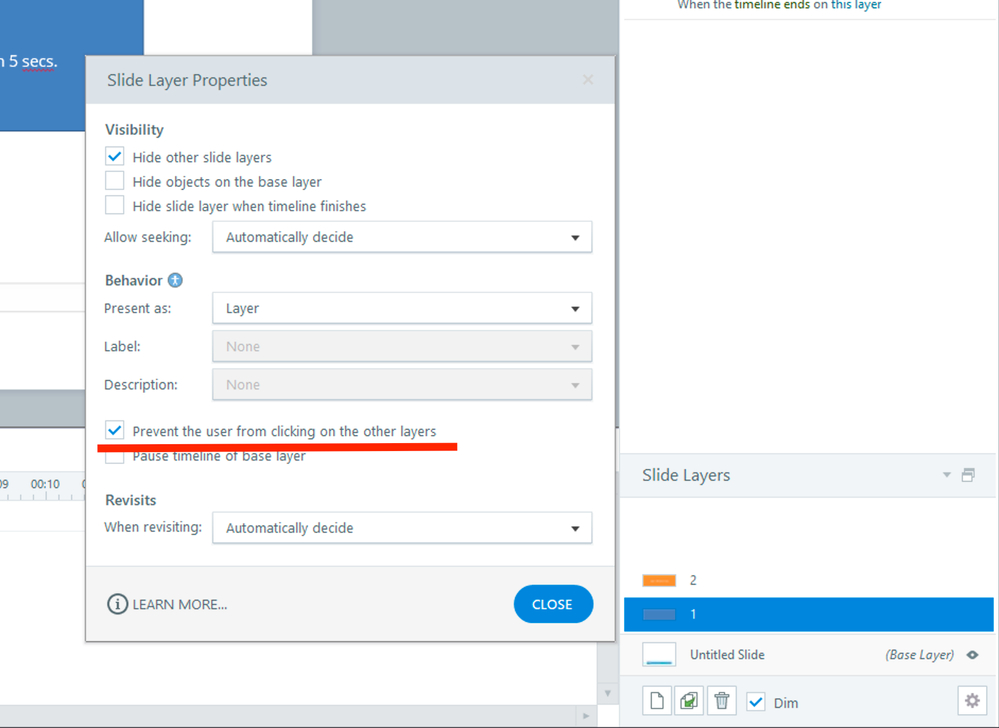 You can prevent learners from clicking on your slider until they've finished viewing a slide by enabling this option in 'Slide Layer Properties'.