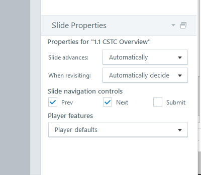 This is my first project using Storyline and when I preview the scene I built, one it gets to the end of the timeline for each slide it auto advances to the next slide. I checked the player triggers and deleted the tirgger to move to the next slide once the timeline ends but it still advances when I preview it. I wasn't prepared to load the file yet to my LMS for testing. Any suggestions on settings I might be missing?