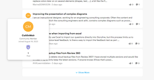 The other small thing that I also find annoying? In the discussion list, it says how long ago the most recent entry was made in a discussion. That part is fine. But it only shows the original poster's name, not the name of who entered the most recent reply. On the old site, the list indicated the most recent person who replied. I would often look at posts just because a certain person (e.g., Walt Hamilton, Phil Mayor, you!) had replied. There's actually a lot to learn from doing that, even when a given question isn't immediately relevant.