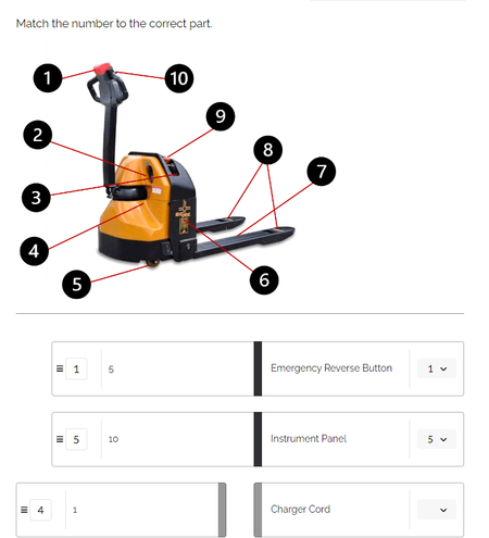 I see. If you won't consider using an SL block (I use an SL block for complex activities in Rise and that works well), how about using letters A-J instead of numbers 1-10 and putting the name of the part on the left and the letters on the right? It should look clearer than numbers and operate more intuitively.