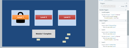 I believe the problem is when your trigger is activated. You had the trigger to change level 2 to normal when the user clicks on it. Instead, I changed the trigger to Set state of Level 2 to Normal when the timeline starts on this slide if Level1Complete=value True. Please try this.