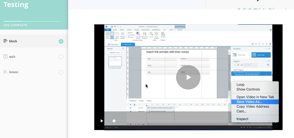 If you are viewing a Rise course that includes a video, you might have the option to right click on the video and choose "Save Video As." Your browser and where you have the Rise course hosted (LMS or Web) might factor in to your permission to grab that content. This example is from using the Rise share URL:Making a Video of a Rise Course