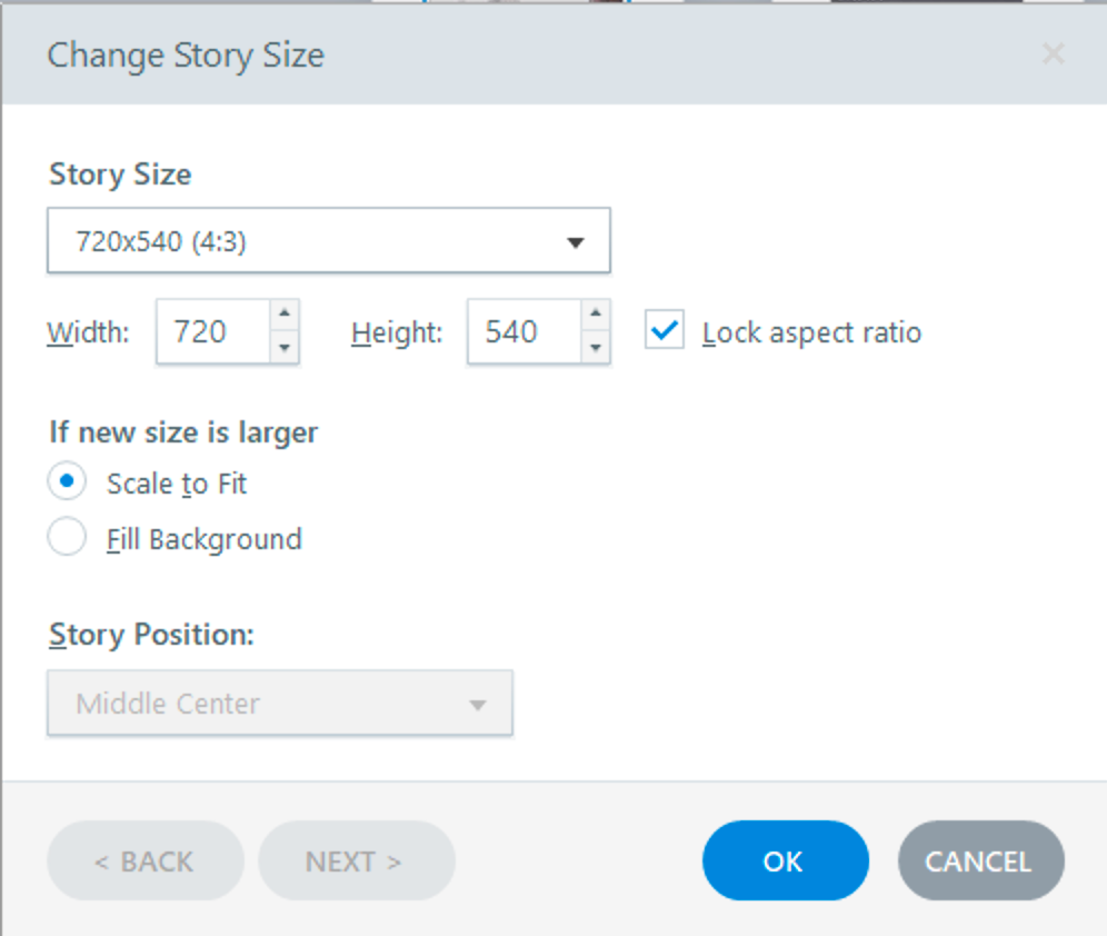 From the Story View, if you navigate to Design >> Then click on Story Size >> what are the current settings being used for your Story Size? Is the Lock Aspect Ratio box checked?
