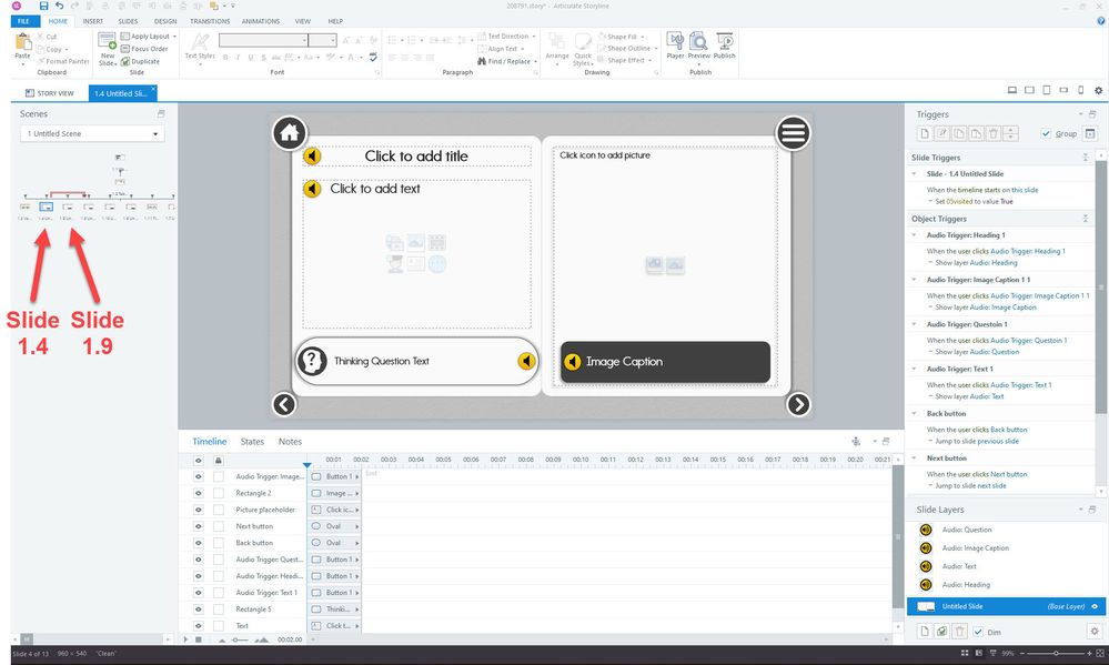 It's a time-waster for me why the visual position of slides in Story View will change based on the order in which shapes/buttons on another slide were added. As I mentioned before, this wouldn't be as big a deal, except that it directly affects how an editor can page or click through thumbnails in the left panel in Story View, especially in branched scenarios, This can lead to errors in triggers that are harder to troubleshoot in Story View because the slides are not in a logical order and cannot be forced to remain in that logical order when I drag them into place.